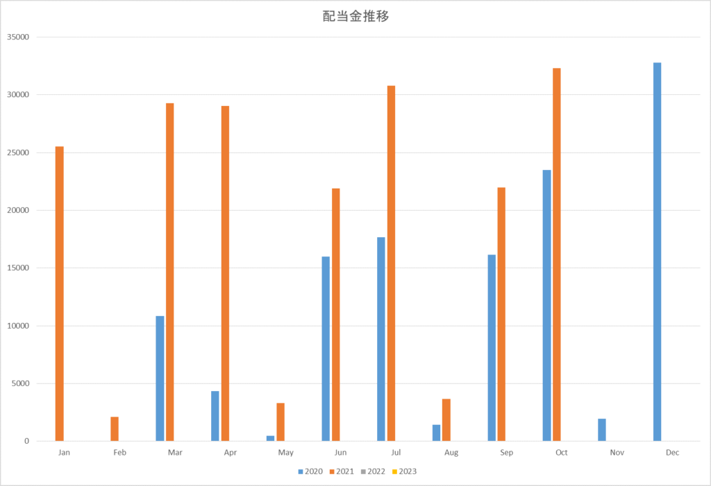 こうしてグラフにしてみると、買い増しを続けている分確実に月ごと配当が増えていることを実感できます。